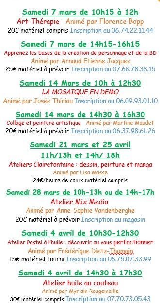 • Les inscriptions ainsi que le règlement des ateliers s’effectuent d’avance à la caisse du magasin (une inscription par téléphone est possible