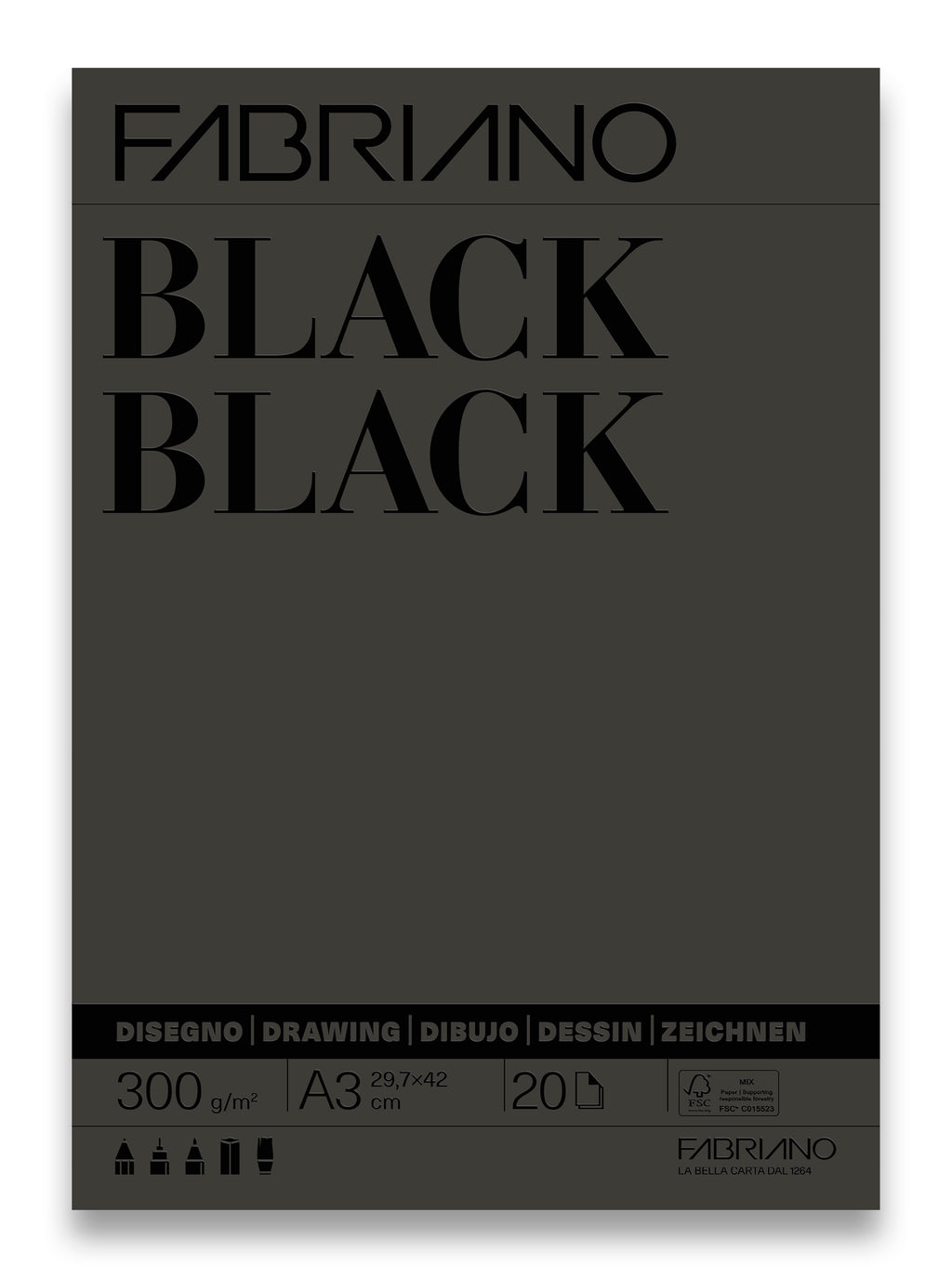 Fabriano Black Black est une série de papiers cartonnés naturels fabriqués avec de la pure cellulose ECF et caractérisés par une haute élasticité et teints dans la masse avec des pigments noirs très stables à la lumière. Idéal pour dessiner avec des pastels et des crayons de couleur, excellent pour les passe-partout et les présentations portfolio.