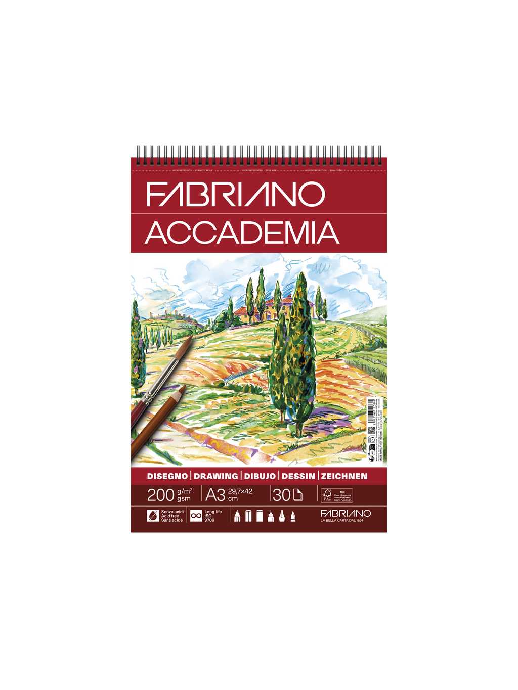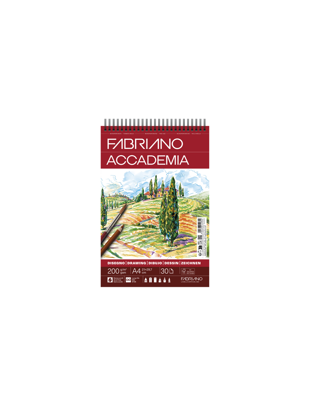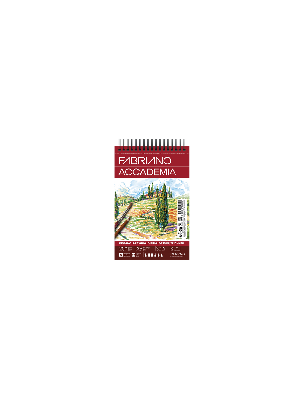 Papier blanc à grain léger, Il s’adapte à toutes les techniques sèches et également à la gouache. Sans acide, il est issu de bois certifié FSC. Disponible en blocs de 30 feuilles, à spirale ou collés en tête, en formats A5, A4, A3 ou A2. 200g/m2.