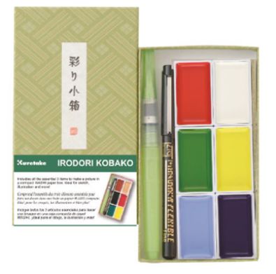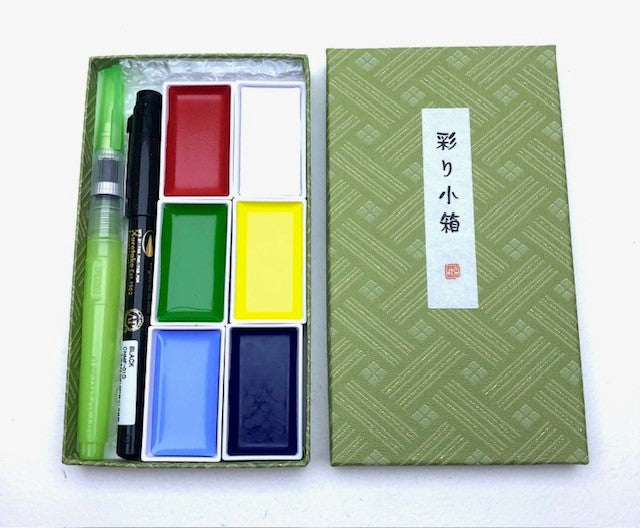 Coffret de 6 nuances d'aquarelles en godets japonais traditionnels + ustensiles