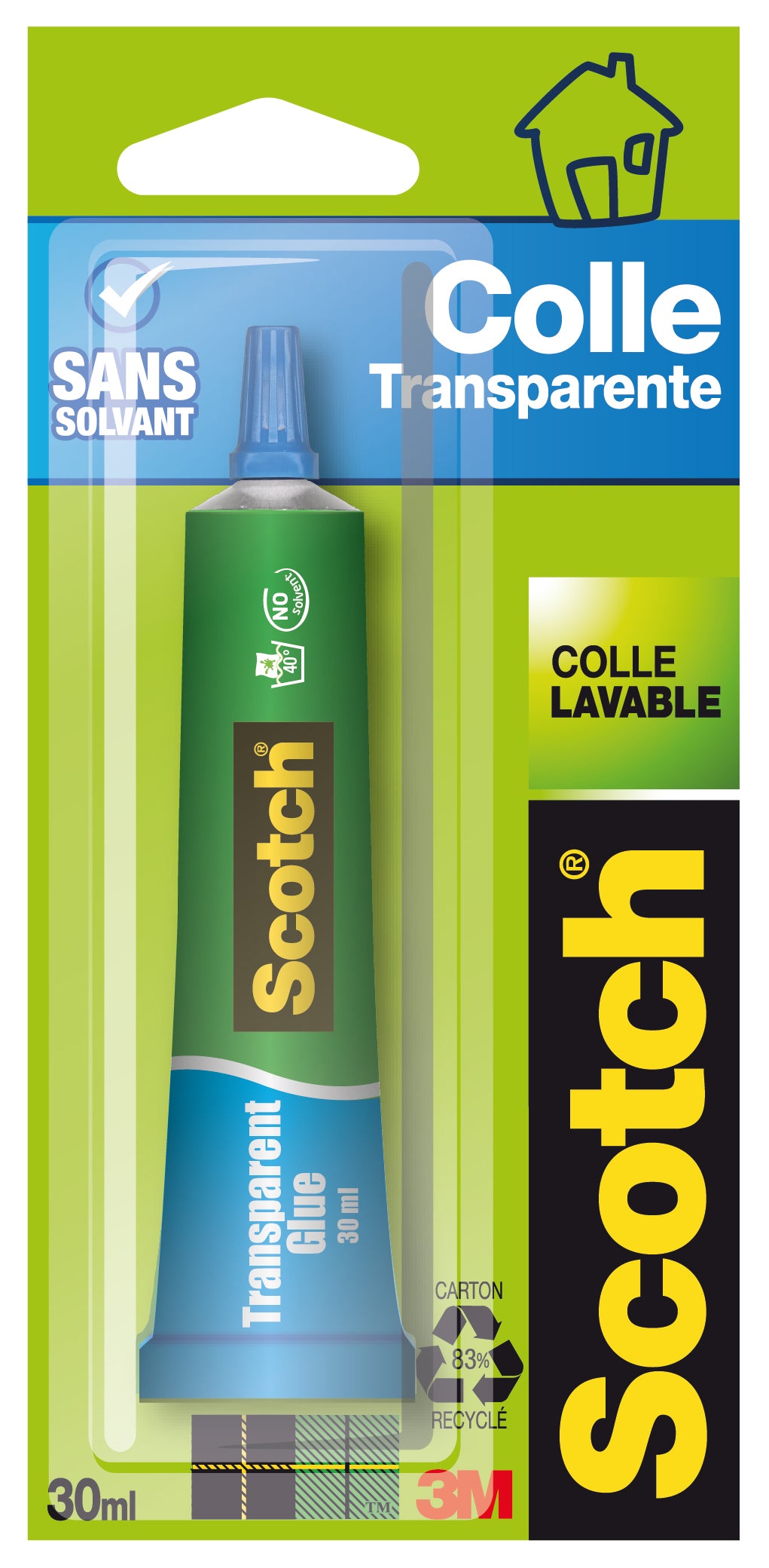 La colle transparente à usage domestique Scotch® est un adhésif sans solvant adapté aux applications domestiques générales sur le bois, le papier, le tissu et le carton. La colle est un puissant adhésif à base d'eau transparent après séchage. Fournie avec un embout pointu pour une application précise.