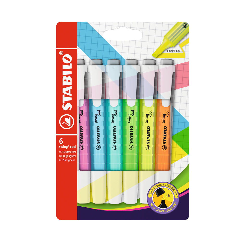 Cette pochette de 6 surligneurs fluo STABILO swing cool se compose des couleurs : orange, jaune, vert, bleu vert, bleu, rose