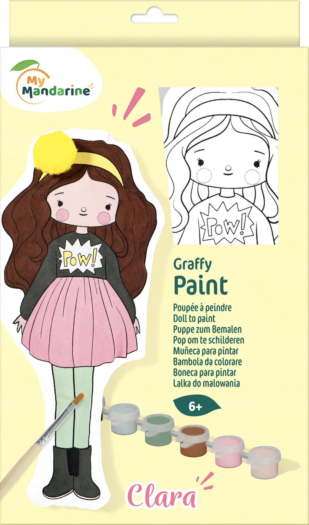 1 poupée en coton imprimé de 29 cm environ - 1 pinceau - 6 flacons de peinture - 1 pompon.