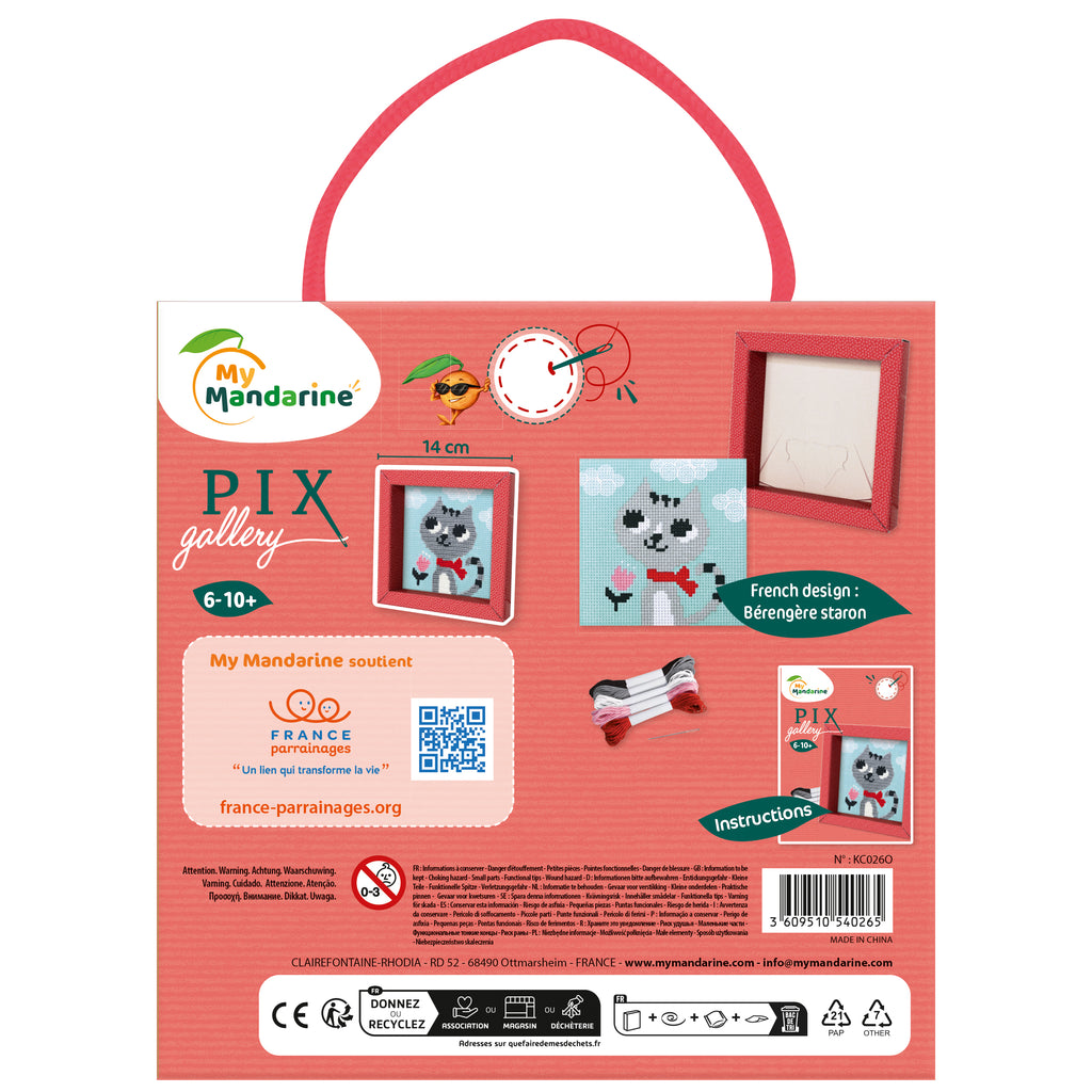 Contient : Un tissu imprimé 12.7x12.7 cm, Un cadre 14x2x14 cm, 5 fils, 1 aiguille, Pas à pas inclus