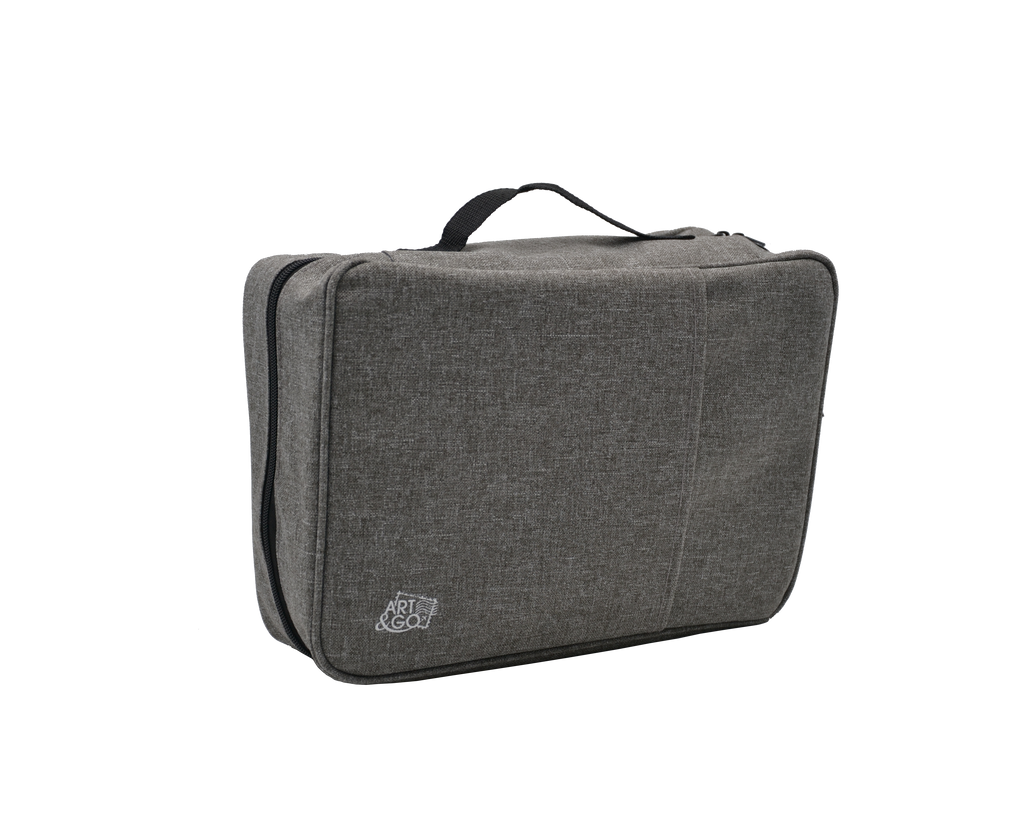 Grand espace de rangement pouvant accueillir aussi un carnet A5, multiples poches offrant des espaces de rangements pour des pinceaux, des gommes et bien d'autres accessoires.