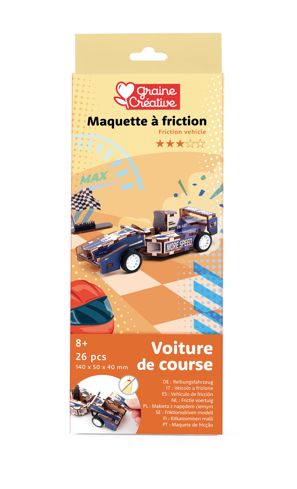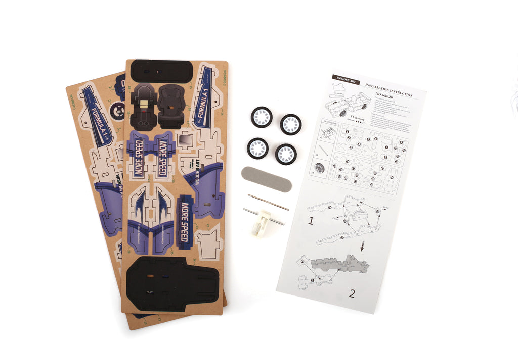 Contient : Planches pré-découpées à dépuncher, système de friction (roues, essieux, engrenage) en plastique.