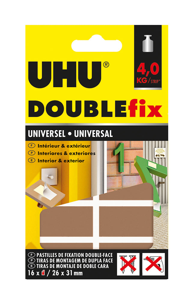 Pastilles adhésives double face super solide pour le montage permanent et la fixation d'objets dans les espaces intérieurs et extérieurs. Le ruban adhésif de montage ultra résistant pour une utilisation universelle. Offre un support permanent et fiable sur la plupart des surfaces lisses et légèrement rugueuses, comme le métal, les carrelages, les matières plastiques, le verre, le bois, le plâtre, la pierre et le béton, par exemple. Idéal pour fixer les panneaux, les numéros de maison, les supports, les crochets, les éléments d'étagères, les chemins de câbles, les objets décoratifs, les profilés ornementaux et bien plus encore. Résistance finale après 60 minutes. Résiste à l'humidité.