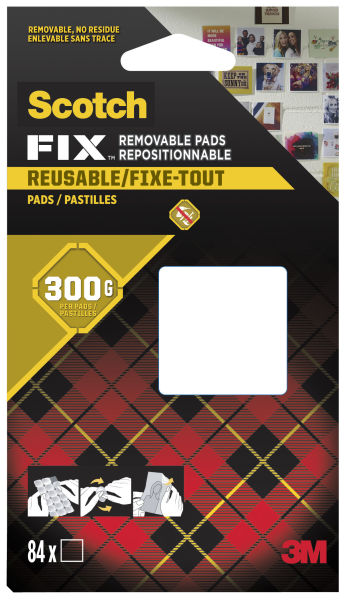 Les pastilles adhésifs amovibles Scotch-FIX™ sont des pastilles en pâte, conformables et ne laissant aucun résidu, idéaux pour le montage léger sur des surfaces peintes ou tapissées. Capables de supporter jusqu'à 300 g, ces pastilles adhésifs amovibles adhèrent à une variété de surfaces poreuses et non poreuses.