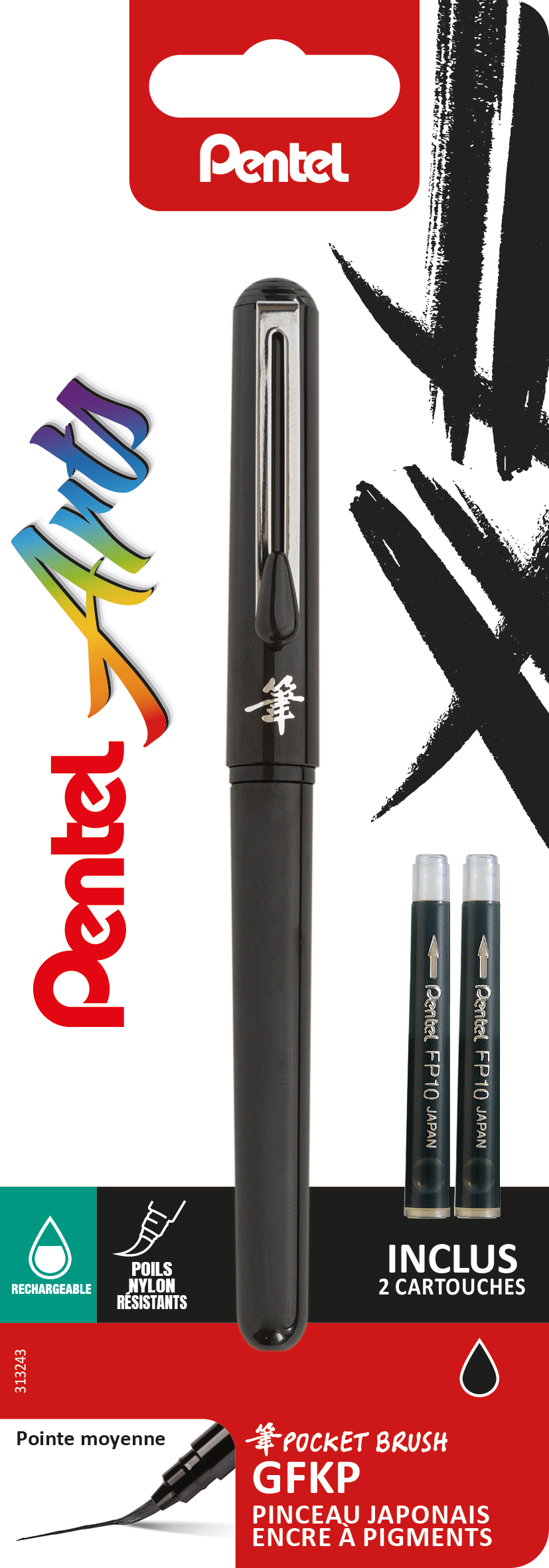 Le Pocket Brush est le partenaire idéal pour calligraphier et dessiner. Idéal pour tous types de calligraphies. Cet outil indispensable est très apprécié des designers et illustrateurs, il est aussi un pinceau de base pour tous les dessinateurs. L'encre noire à pigments résistante à l'eau et à la lumière, est particulièrement intense. Elle sèche en 60 secondes. La pointe est constituée de poils synthétiques très fins, ce qui permet d'obtenir des traits fins ou plus larges d'un seul coup de pinceau. Le pinceau est rechargeable avec des cartouches spéciales.