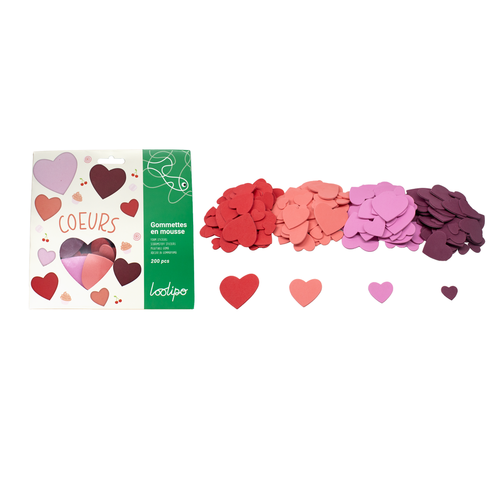 Pack de 200 mousses adhésives coeurs prédécoupées (tailles et coloris assortis).